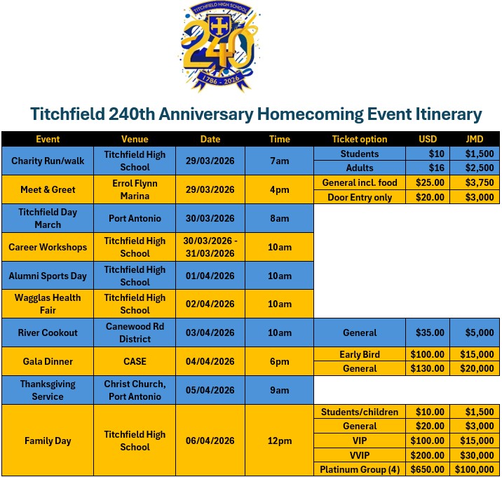 Titchfield High School, the fifth oldest high school in Jamaica, proudly announces its 240th anniversary celebrations with a landmark reunion week dubbed the “Mother of All High School Reunions.”